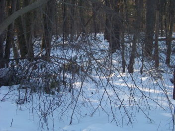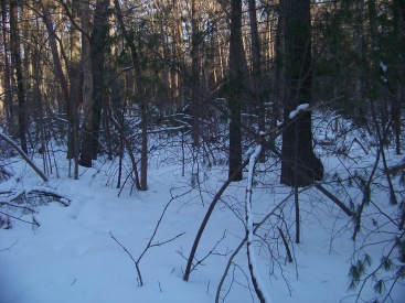 Many of these have blown away. Trees bent over from heavy snow also obscure the line of the trail.
