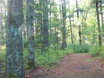 The hiking trail starts wide and gravel bound. The John Sherman Path leaves immediately to the left. The first part of this trail is marked by blue rectangles.