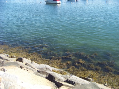 There at the corner of where the restaurants in the downtown area start, to the side of the parking, the breakwater begins with it's huge boulders.