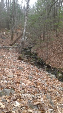 At the bottom of the hill, at .87 miles, the trail intersects the lower trail that leads along the river. Here the inner loop trail goes right, while the lower trail and the way of the three town loop goes left crossing the stream on another stone step way across.